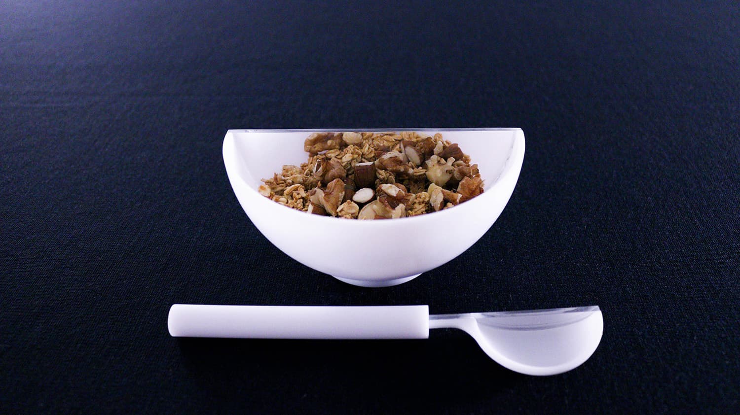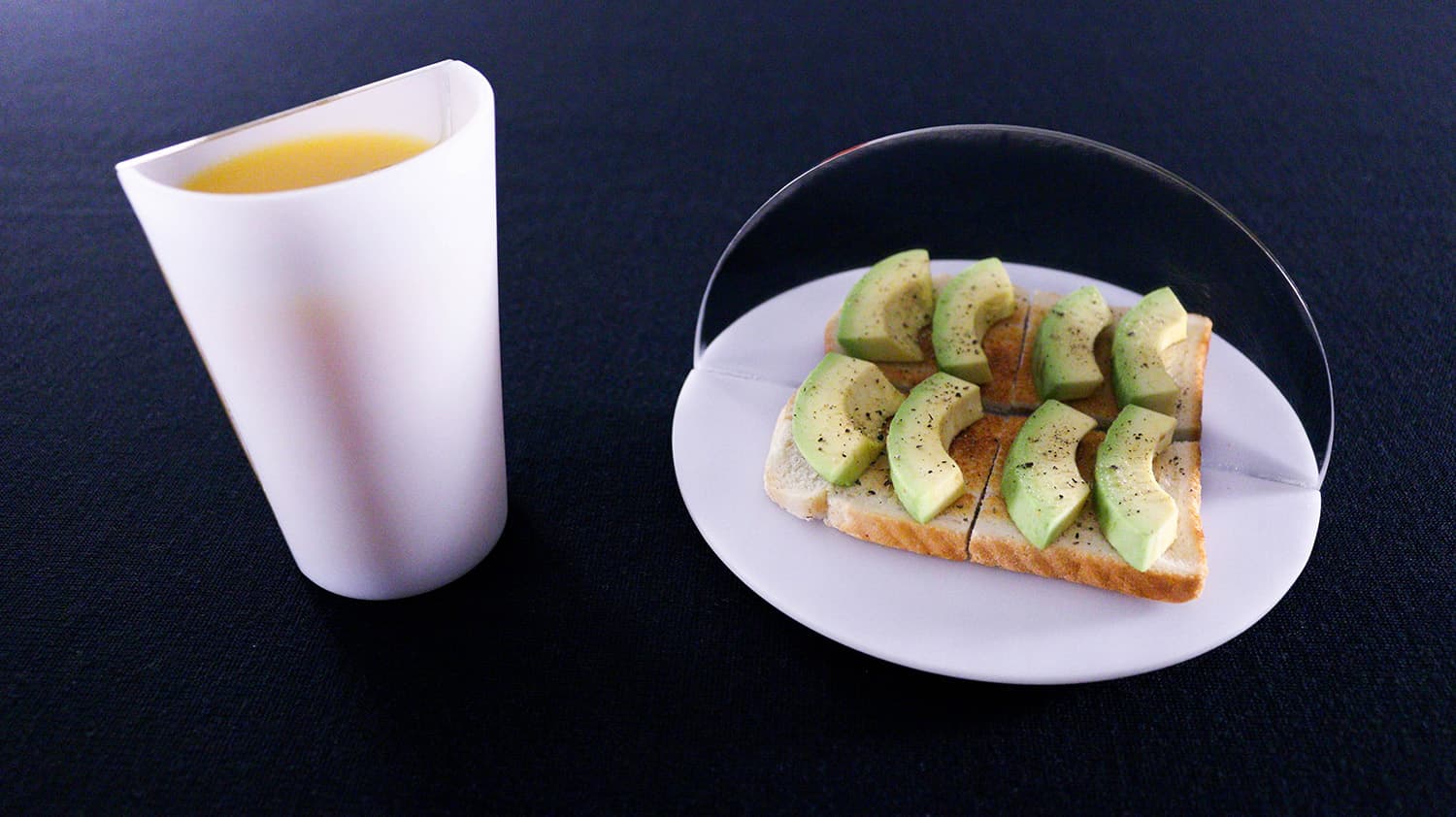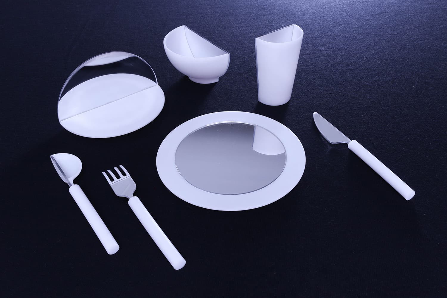 The design of HALF / FULL is based on current research around our behaviour at the dinner table. A study led by the University of Tokyo revealed that the apparent volume of food can influence one’s satisfaction from a meal. If the quantity of food appears greater, the feeling of satisfaction is greater. Applying these findings, HALF / FULL integrates mirrors into common dining items to trick our visual perception of what we eat, increasing our satisfaction while enabling us to consume less. Although the concept is yet to be formally tested, we believe HALF / FULL is a simple and playful approach that has the potential to change our eating habits for the better, while acting as a visual probe that raises our awareness around the impacts that climate change will have on our food and eating culture.